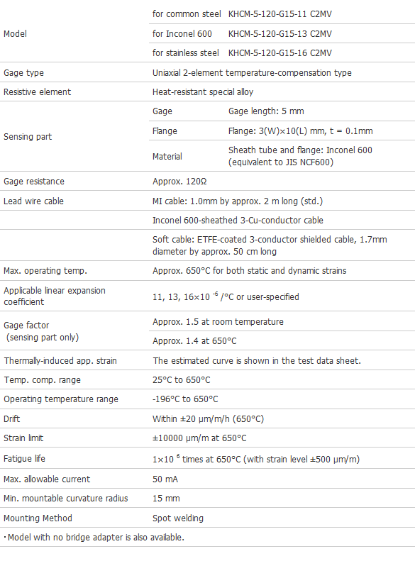 Resistance: 120??, Gage factor (650??C): Approx. 1.4, Material: Inconel 600 (NCF 600) Installation Method: Spot welding Operating Temperature Range: –196 to 650??C