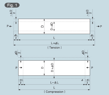 See the lower illustration in Fig. 1. If the material receives a compressive force, it bears a compressive strain expressed as follows: