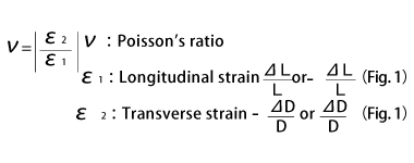 Stress is thus obtained by multiplying strain by the Young's modulus. When a material receives a tensile force P, it elongates in the axial direction while contracting in the transverse direction. Elongation in the axial direction is called longitudinal strain and contraction in the transverse direction, transverse strain. The absolute value of the ratio between the longitudinal strain and transverse strain is called Poisson's ratio, which is expressed as follows: