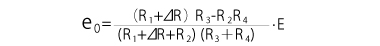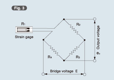 Strain initiated resistance change is extremely small. Thus, for strain measurement a Wheatstone bridge is formed to convert the resistance change to a voltage change. Suppose in Fig. 3 resistances () are R1, R2, R3 and R4 and the bridge voltage (V) is E. Then,the output voltage e o (V) is obtained by the following equation: