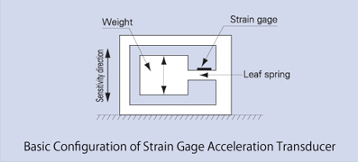 With the basic configuration shown below, acceleration initiates inertia force to the weight and deforms the leaf spring. The strain gage adhered to the leaf spring detects the displacement of the leaf spring as a strain quantity proportional to the acceleration. The strain gage signal is amplified to enable acceleration measurement. An advantageous feature of this configuration is to enable the transducer to respond to static acceleration at DC.